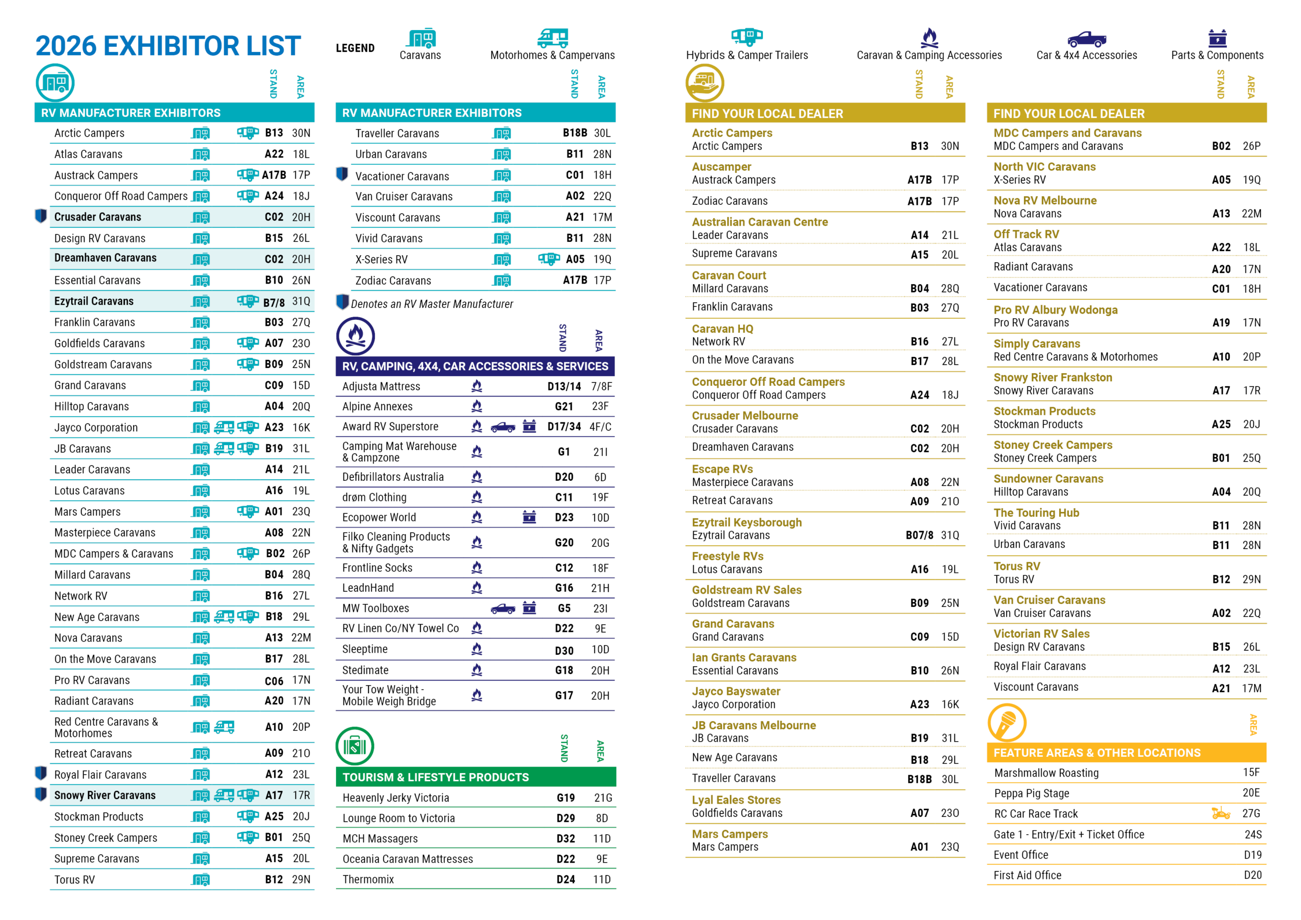 The Cranbourne Caravan & Camping Leisurefest Show Guide is your go-to companion for everything happening at this year’s event. Packed with essential information, it features the full exhibitor line-up, a clear event map to help you navigate with ease, details on the exciting Passport to Freedom® Competition, and plenty more to enhance your show experience from start to finish.
